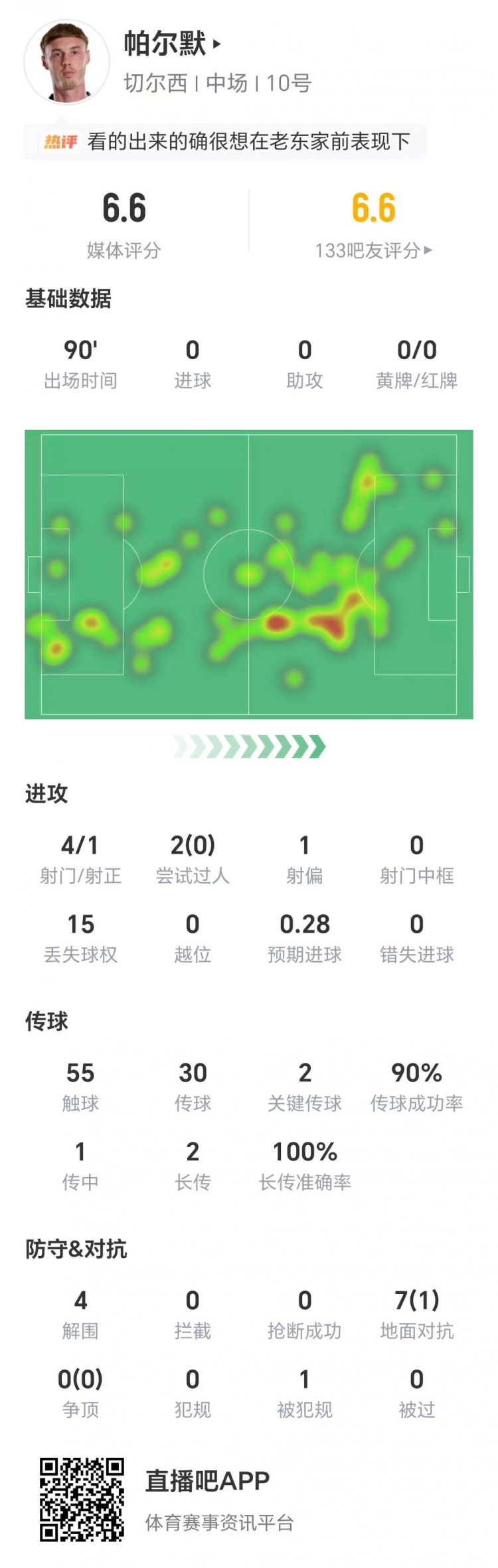 赛后技术统计数据显示,帕尔默本场比赛4射1正,两次过人均未成功,15次丢失球权,两次关键传球,4次解围,7次地面对抗仅成功1次,获评6.6分。
