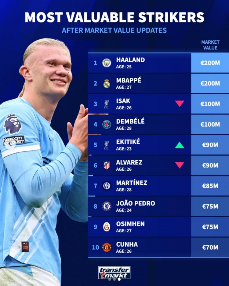 直播吧4月13日讯 德转更新了足坛中锋身价情况,哈兰德和姆巴佩均两亿欧,伊萨克、登贝莱均1亿欧紧随其后。