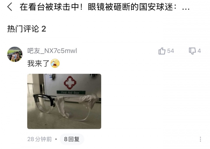 【相关新闻】太倒霉了😂有国安球迷在看台上被球砸到,眼镜折断