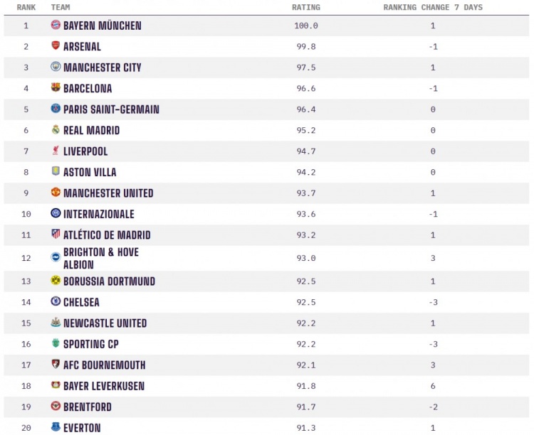 直播吧4月13日讯 著名数据机构OPTA对全球超过10000家俱乐部打造了一个评分系统,评分范围从0到100。其中,0分代表全球最弱的球队,而100分则代表全球最强的球队。在OPTA全球俱乐部实力榜中,拜仁、阿森纳、曼城、巴萨以及巴黎圣日耳曼位居前五。