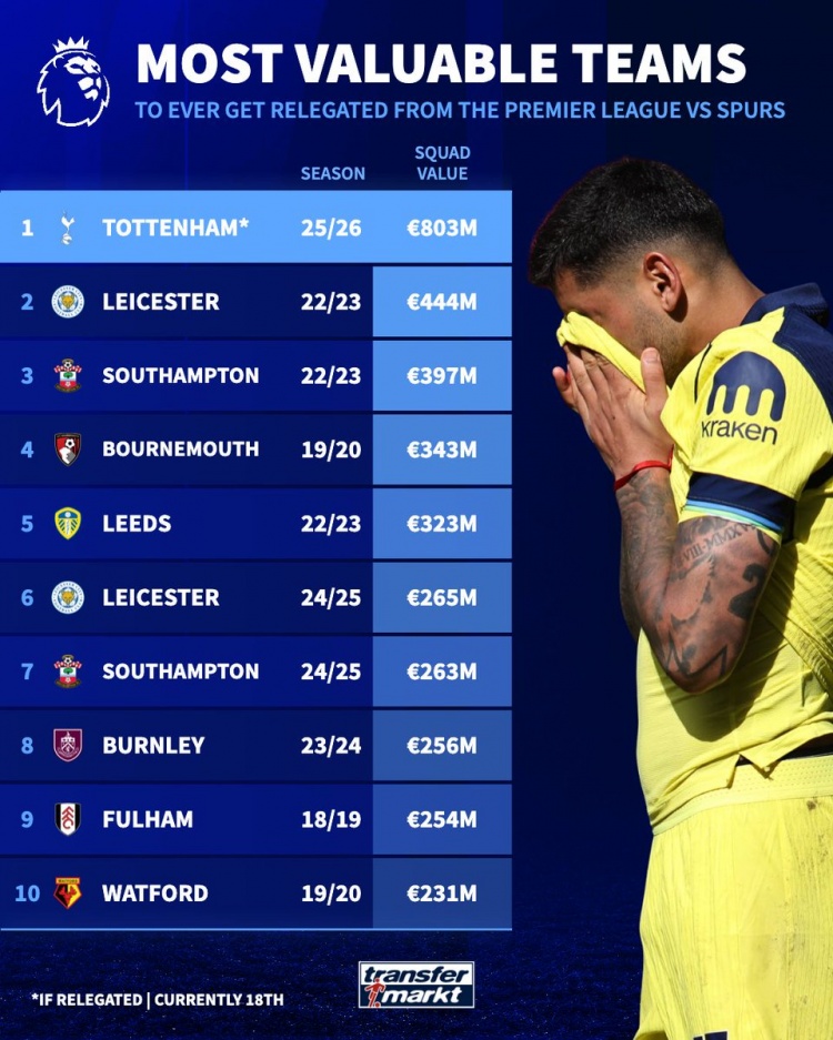 直播吧4月13日讯 据德国转会市场统计,如果热刺本赛季降级,将成为英超历史上身价最高的降级球队。