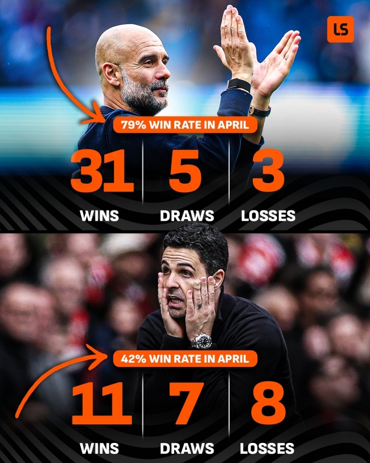 据Livescore统计,四月是瓜迪奥拉执教球队在英超表现最好的月份,胜率高达79%,而四月却是阿尔特塔执教阿森纳表现最差的月份,胜率仅42%。