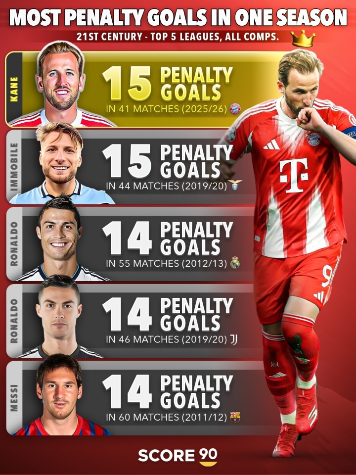 直播吧04月13日讯 Score90列出了本世纪单赛季点球进球榜,凯恩以15球与因莫比莱并列第一,C罗、梅西以14球并列第三。