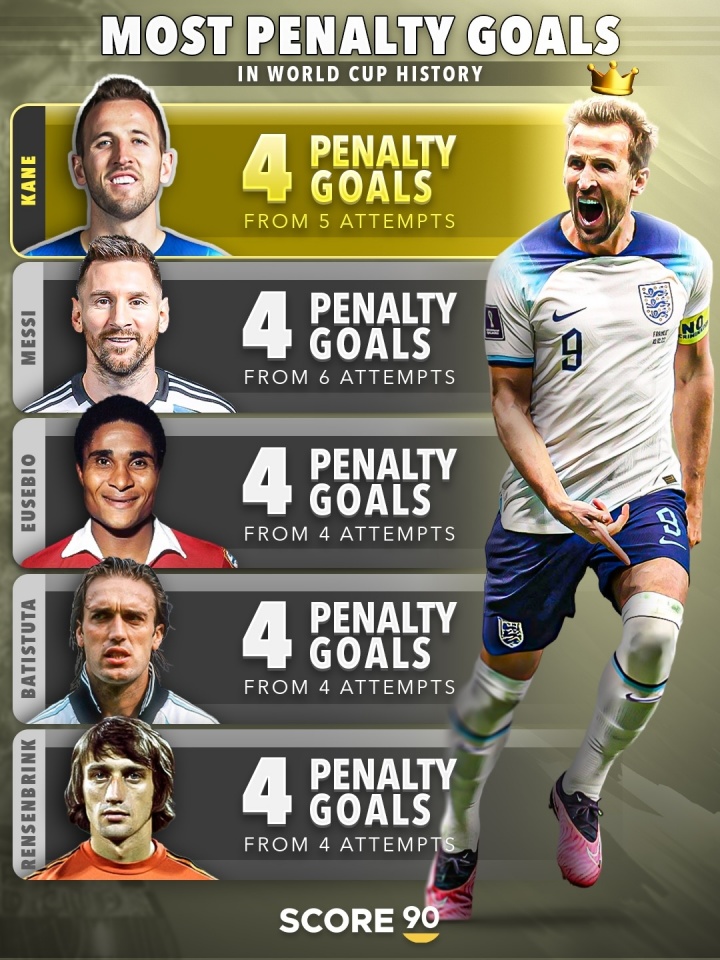 此外,随着世界杯临近,该媒体还列出了世界杯点球进球榜,凯恩、梅西等4人打入4粒点球最多。
