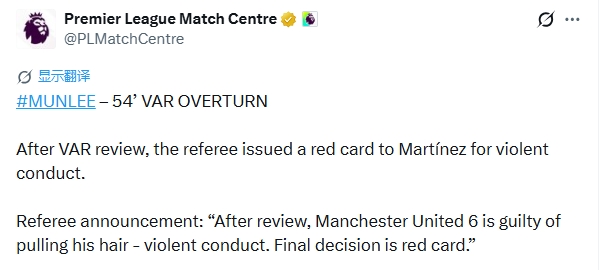 裁判通告:“经回看确认,曼联6号球员存在拉扯对方头发的暴力行为,最终判罚为红牌。”
