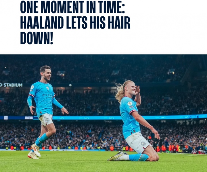 最终,曼城4-1大胜,德布劳内2射1传,哈兰德最后时刻披头散发打入一球,曼城也以“哈兰德放下头发”为这一瞬间的标题。