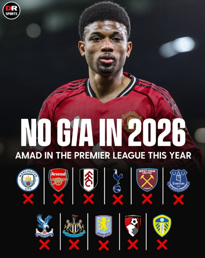 据统计,阿玛德在2026年出场的11场英超比赛中还从未参与进球,本赛季26场英超也只贡献了2球2助攻。