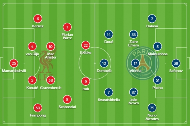 巴黎首发:39-萨福诺夫、2-阿什拉夫、51-帕乔、5-马尔基尼奥斯、25-门德斯、87-若昂·内维斯、17-维蒂尼亚、33-埃梅里、7-克瓦拉茨赫利亚、10-登贝莱、14-杜埃