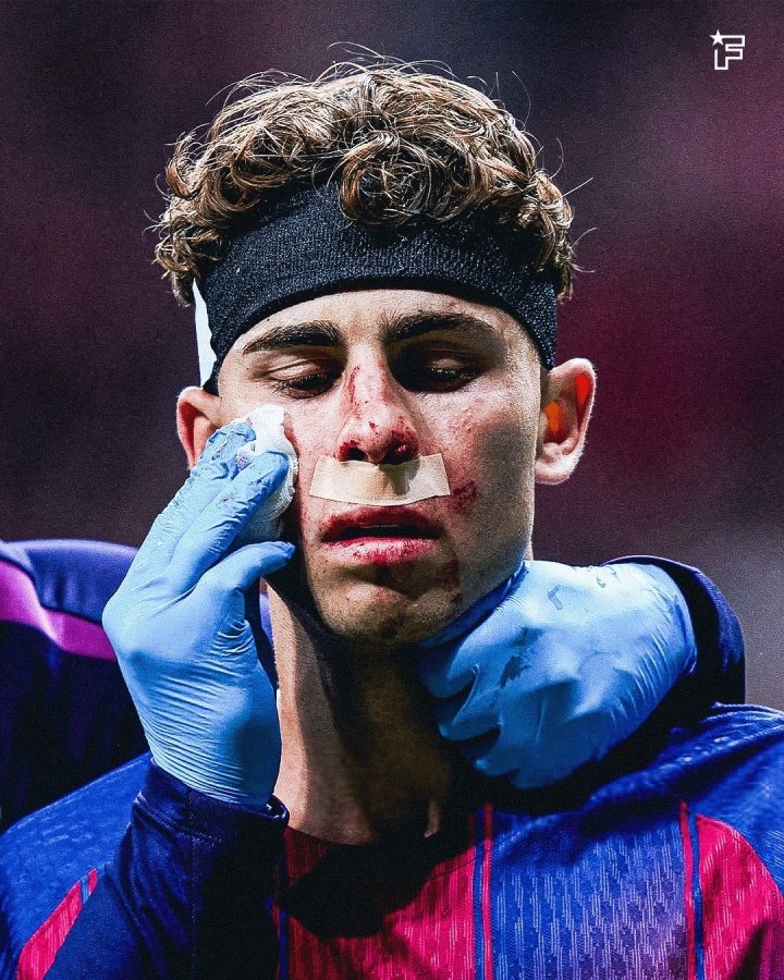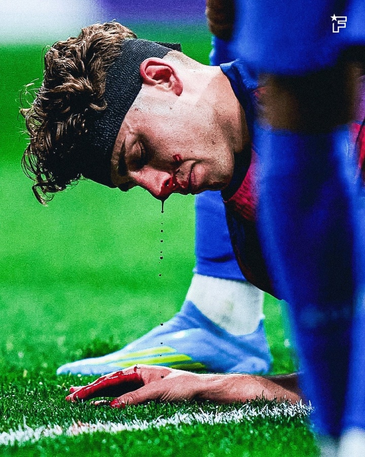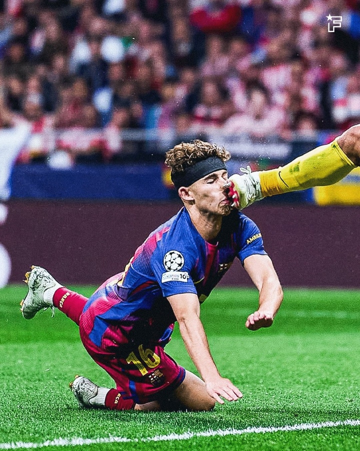 直播吧04月15日讯 欧冠1/4决赛次回合,马竞vs巴萨,第26分钟,费尔明头球攻门,随后被穆索踢到头部,倒地撞向地面,当场血崩!