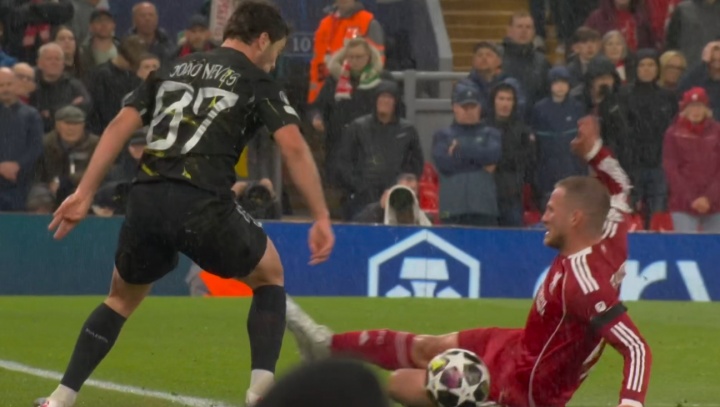 麦卡利斯特铲倒内维斯被出示黄牌,若晋级将累积黄牌停赛