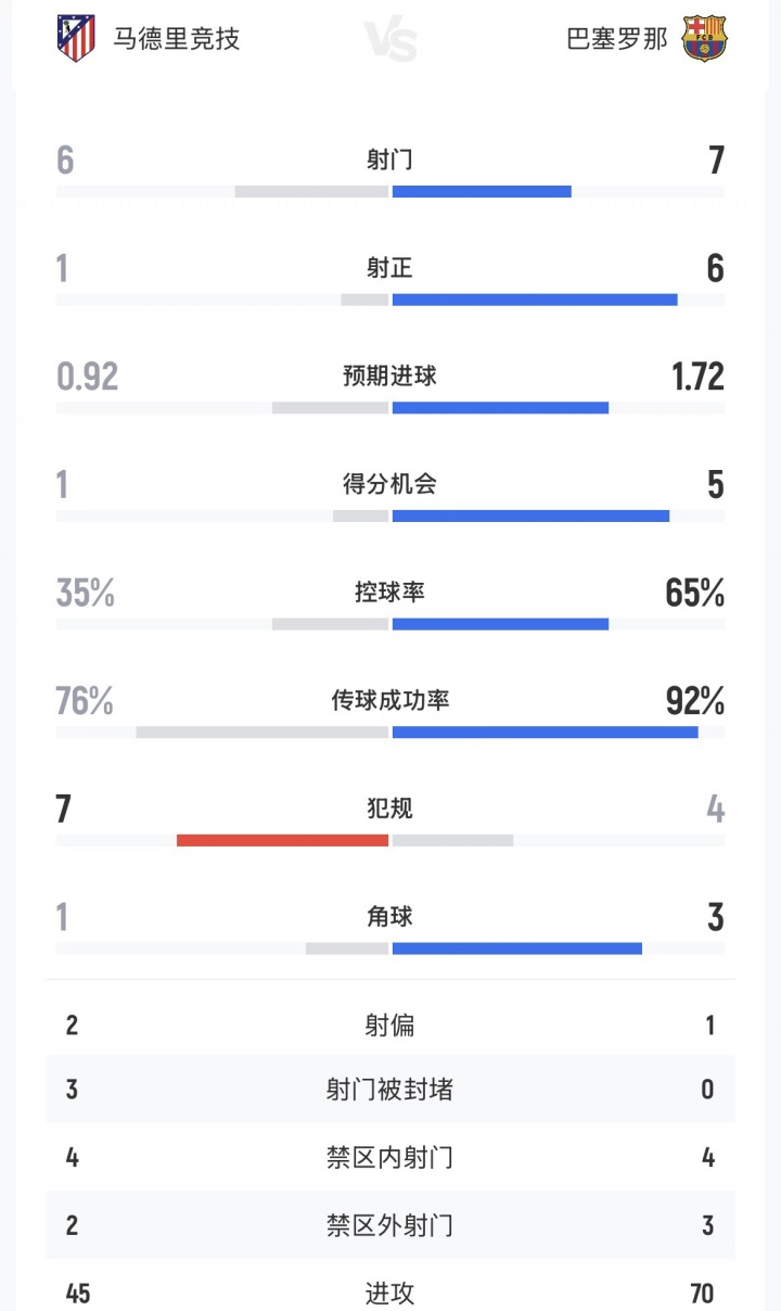 直播吧04月15日讯 欧冠1/4决赛次回合,马竞对阵巴萨。巴萨半场数据全面占优。