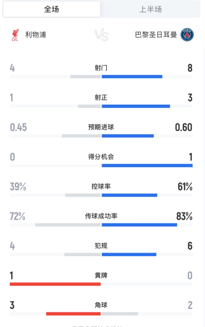 直播吧04月15日讯 利物浦vs巴黎半场结束,利物浦0-0总比分仍0-2落后巴黎。半场数据如上图。