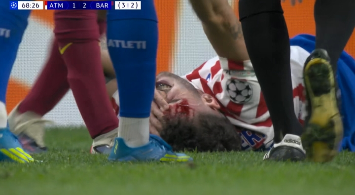 直播吧04月15日讯 欧冠1/4决赛次回合,马竞vs巴萨,第69分钟,鲁杰里被加维肘击,倒地满脸是血,加维染黄!