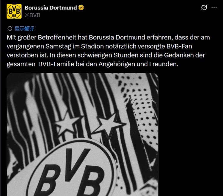 多特写道:“多特蒙德足球俱乐部怀着沉痛的心情获悉,上周六在球场内接受紧急医疗救治的那位BVB球迷已不幸去世。在这艰难的时刻,整个BVB大家庭的心与逝者的亲属及朋友同在。”
