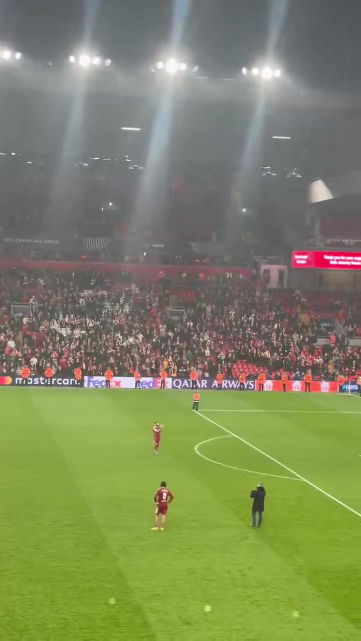 球迷赛后高唱萨拉赫之歌,萨拉赫拍手向球迷致意。