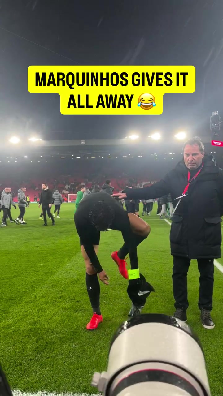 巴黎队长马尔基尼奥斯赛后与球迷互动,面对热情的球迷,已经送出球衣的他脱下球裤扔向看台。