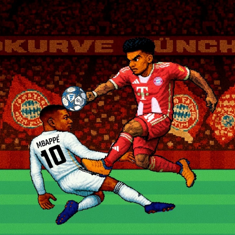 拜仁官方社交媒体发布了一张极具像素复古风格的赛前海报,海报中拜仁边锋迪亚斯与皇马前锋姆巴佩在空中激烈对抗。