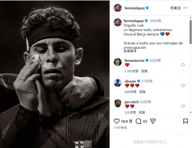 此役巴萨中场费尔明被马竞门将穆索踢到脸部,费尔明社媒晒出脸部受伤的照片,并写道:“巴萨人的荣耀!我们已倾尽全力,我们会再回来的。巴萨万岁,永远!感谢大家的关心留言。”