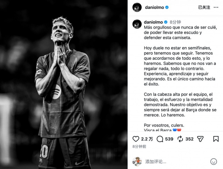 直播吧4月15日讯 欧冠1/4决赛次回合,巴萨客场2比1击败马竞,最终以总比分2-3出局。赛后,奥尔莫社媒发文誓言带巴萨重回应有位置。
