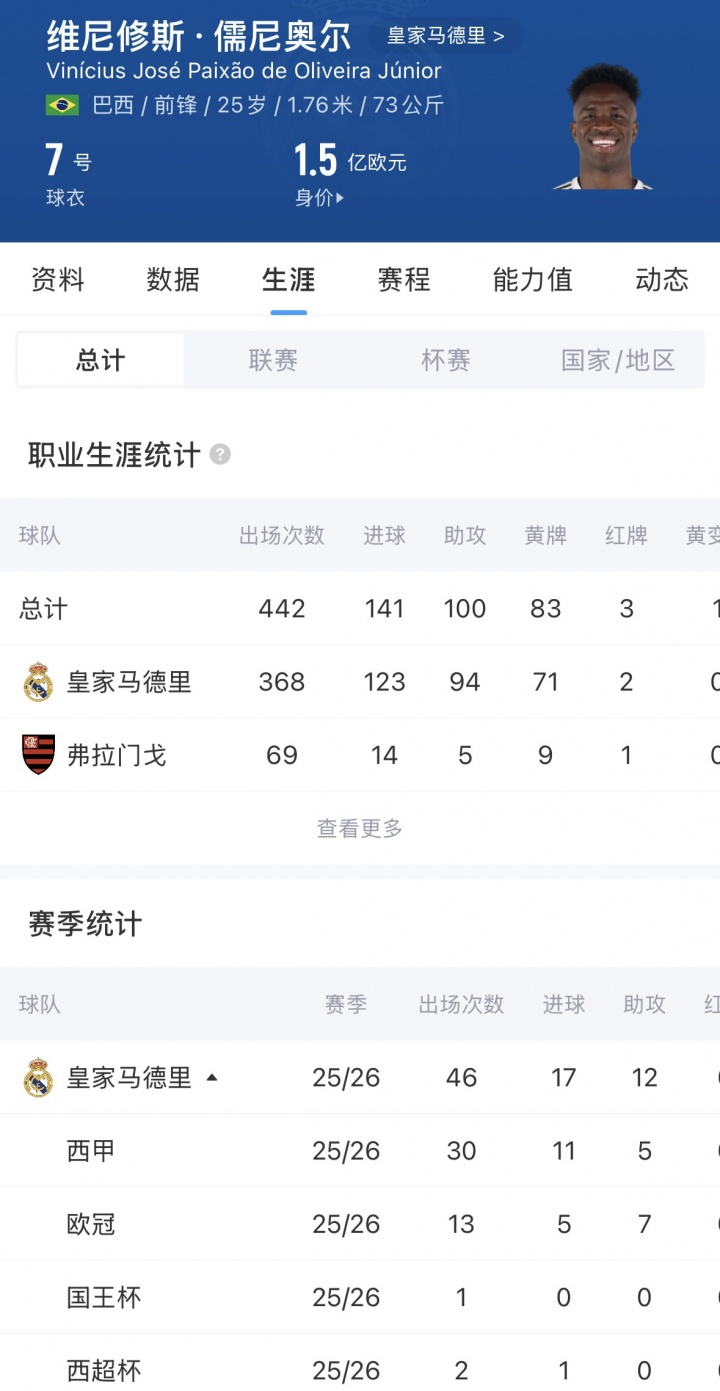 维尼修斯现年25岁,本赛季代表皇马出场46次贡献17球12助,他现身价1.5亿欧。