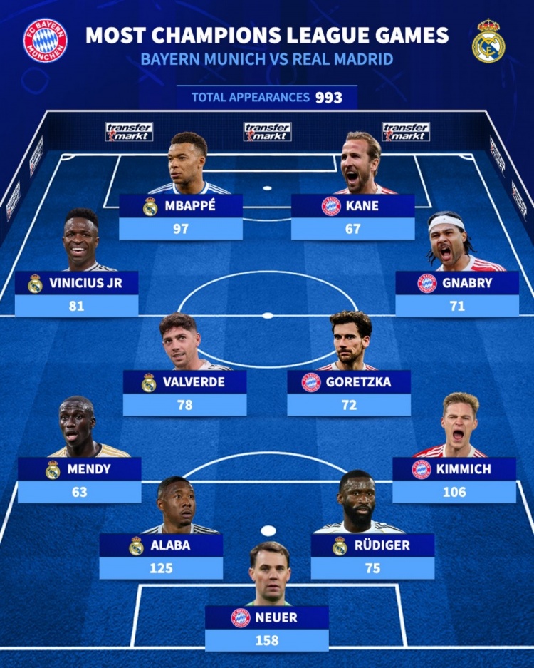 拜仁+皇马欧冠出场最多阵容
