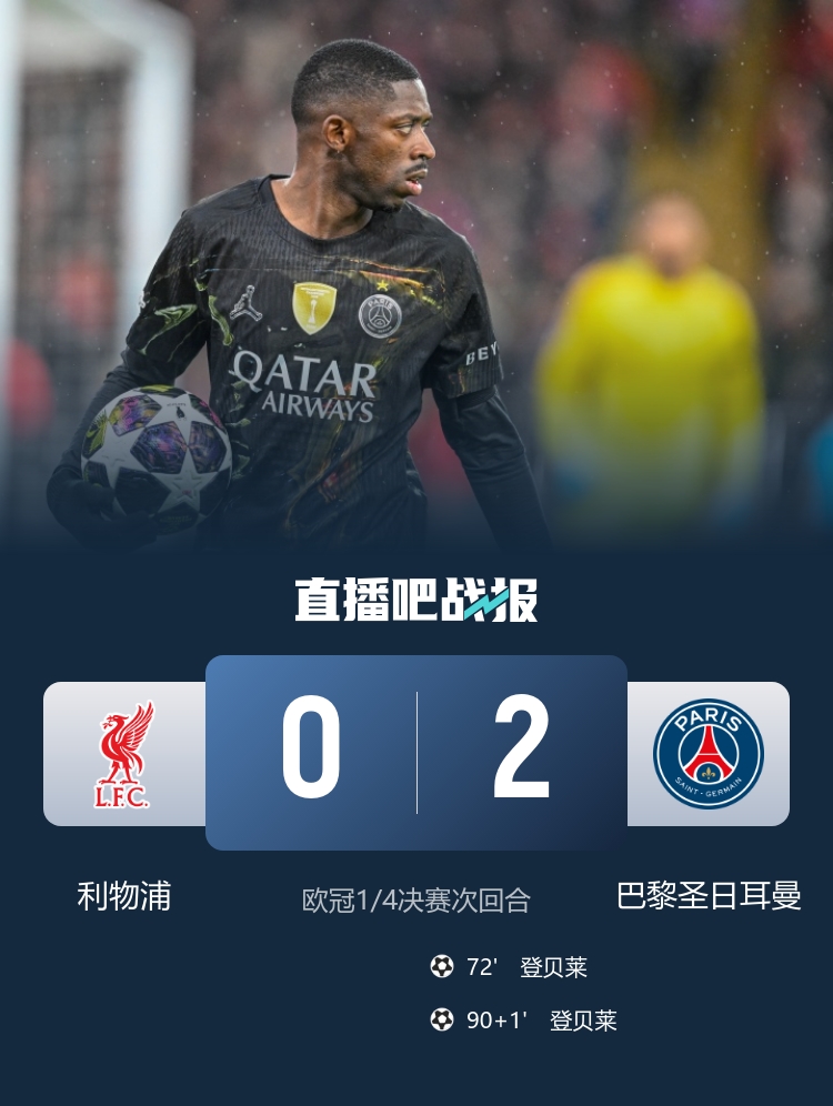 直播吧4月15日讯 北京时间4月15日凌晨3时,欧冠四分之一决赛次回合,利物浦坐镇安菲尔德球场迎战巴黎。上半场双方均无建树,登贝莱错失一次破门良机,埃基蒂克无对抗情况下受伤离场,随后门德斯也因伤被替换下场。巴黎半场0-0战平利物浦。下半场,杜埃因伤下场,麦卡利斯特曾制造了一次点球机会,但是被VAR取消,随后登贝莱上演梅开二度。最终巴黎2-0击败利物浦,以两回合总比分4-0淘汰利物浦挺进四强,将对阵拜仁和皇马之间的胜者。