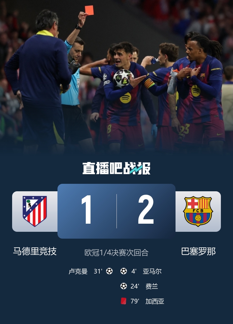 直播吧4月15日讯 北京时间4月15日凌晨3:00,欧冠1/4决赛次回合,马竞坐镇西维塔斯大都会球场迎战巴塞罗那,首回合马竞2-0取胜。上半场朗格莱送礼,亚马尔破门,费兰传射,卢克曼扳回一球,巴萨暂2-1马竞,总比分2-3;下半场费兰破门但因越位被吹掉,埃里克·加西亚直红,最终巴萨2-1战胜马竞,但总比分2-3被淘汰,马竞挺进四强,将对阵葡体和阿森纳之间的胜者。