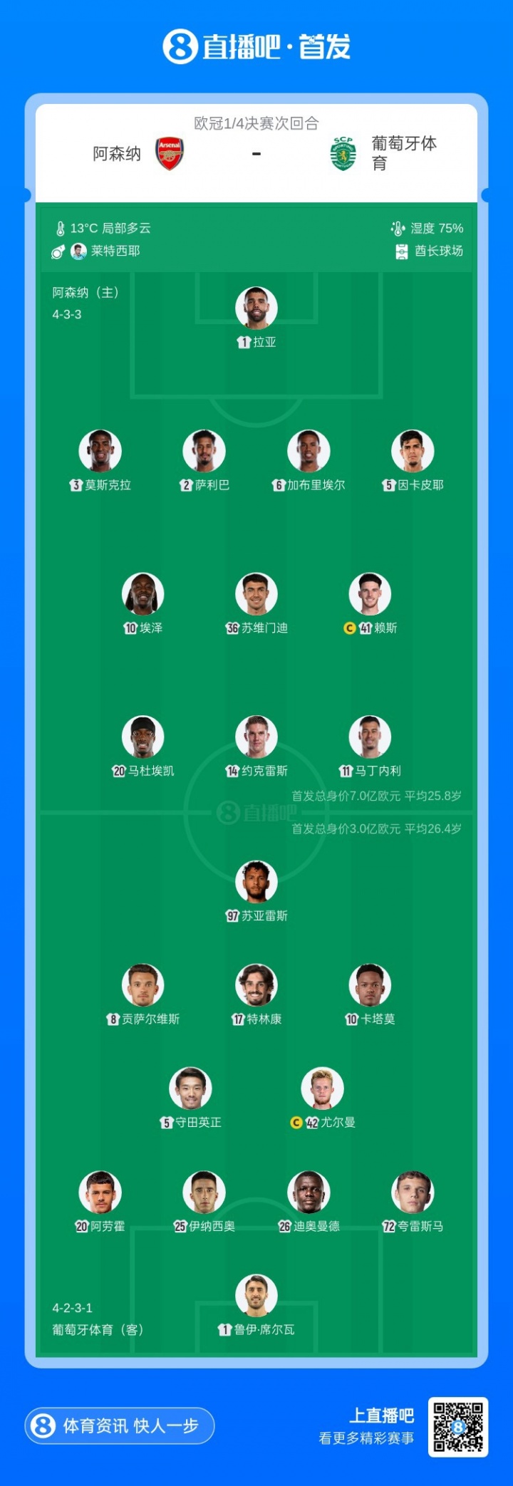 直播吧4月16日讯 欧冠8强次回合,阿森纳主场迎战葡体比赛即将打响。赛前首发出炉。首回合对阵,葡体0-1阿森纳。