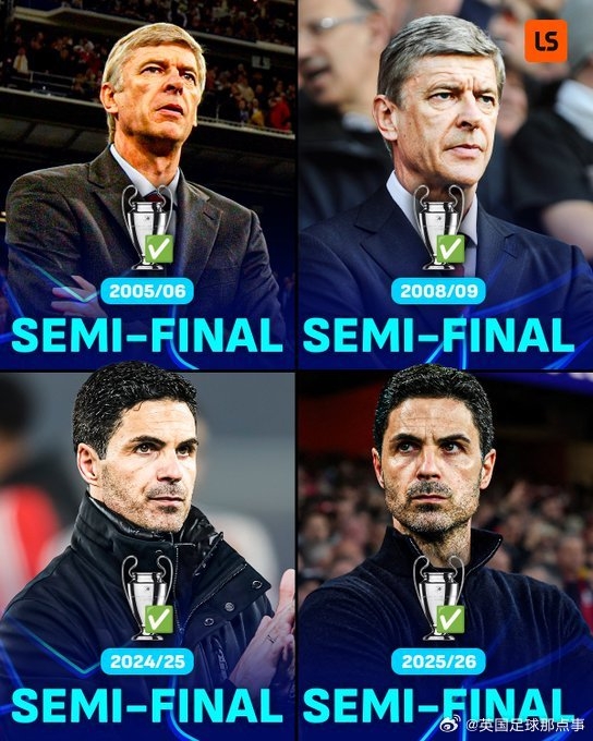>阿尔特塔追平了温格在阿森纳的欧冠半决赛次数👏