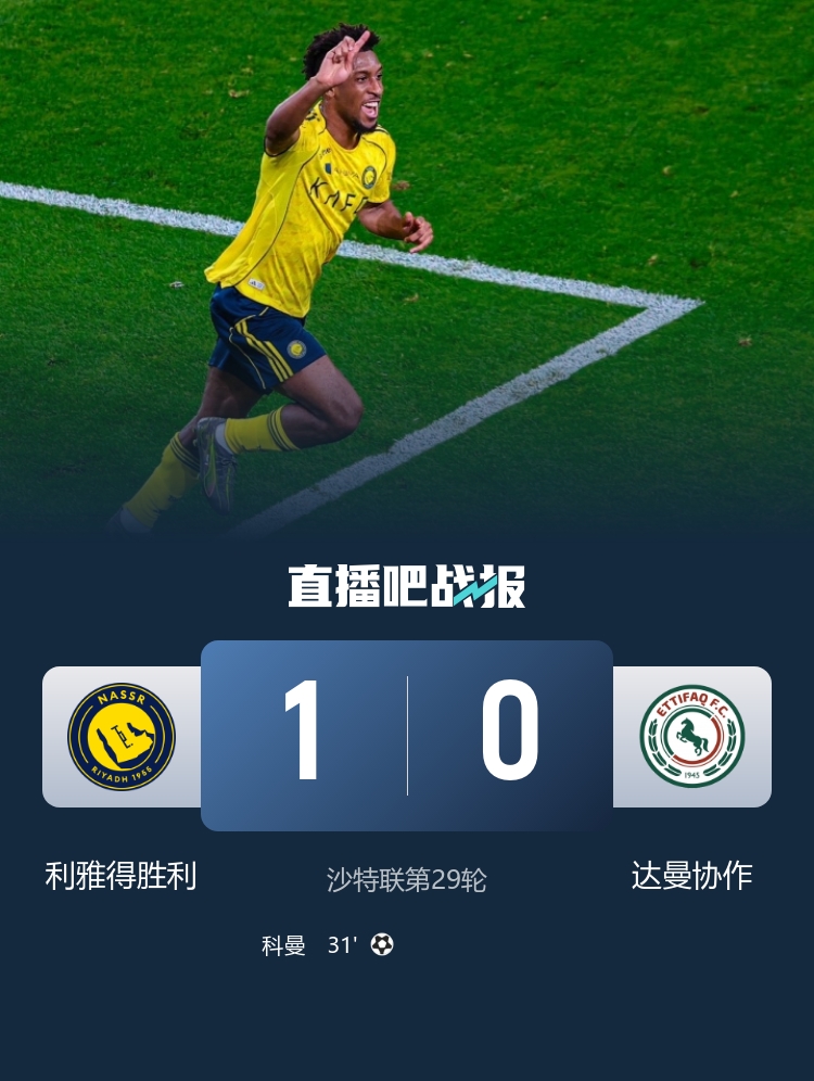 第31分钟,C罗远射造成罗达克脱手,科曼跟进补射破门。利雅得胜利1-0达曼协作。↓