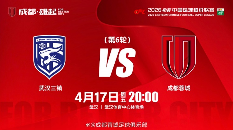 >比赛日 4月17日(周五)20:00中超联赛第6轮 武汉三镇vs成都蓉城