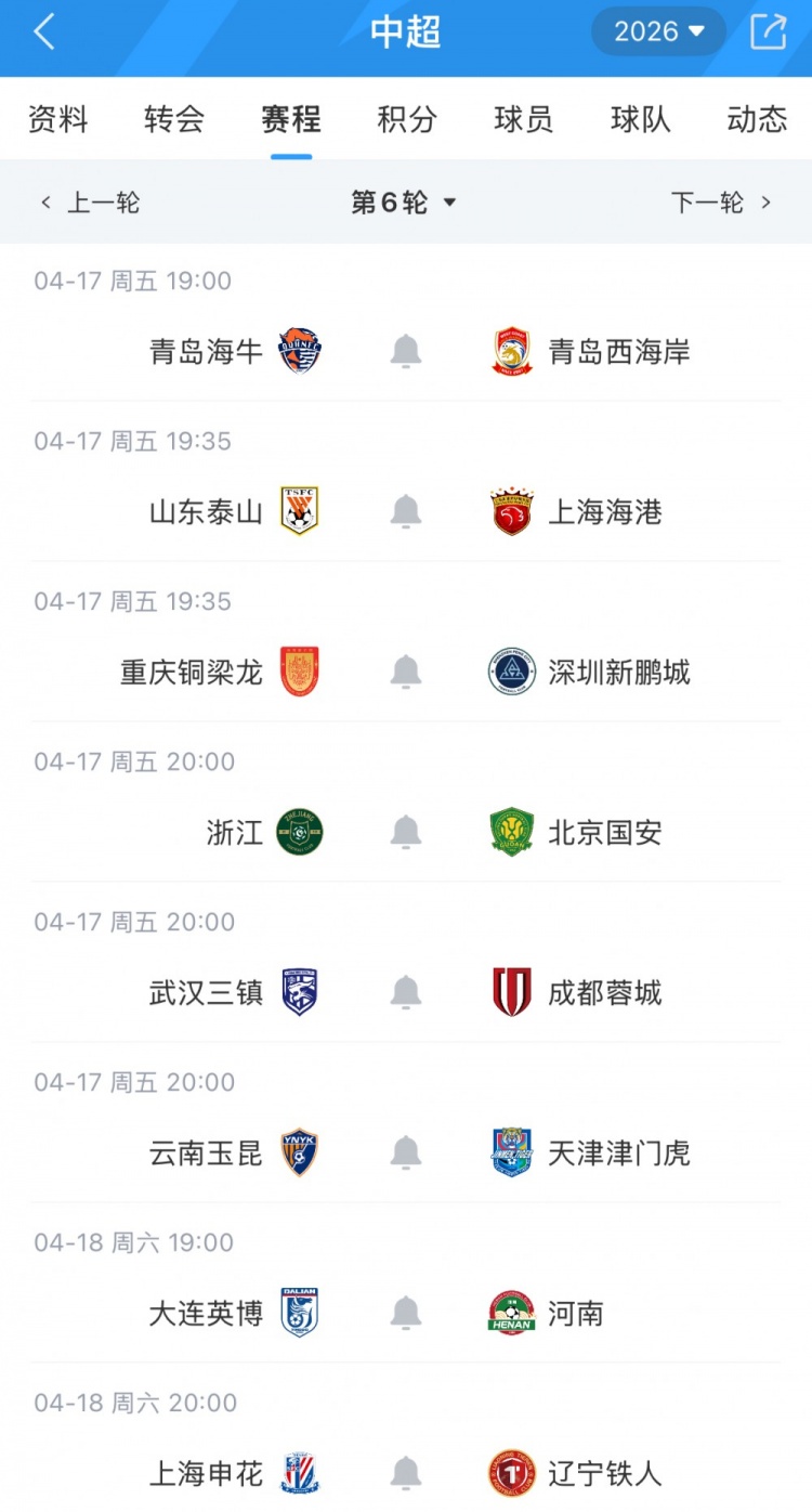直播吧4月17日讯 中超第6轮将于今晚拉开帷幕,8场比赛全部在晚间进行,其中有6场今晚开球,2场明晚开球。