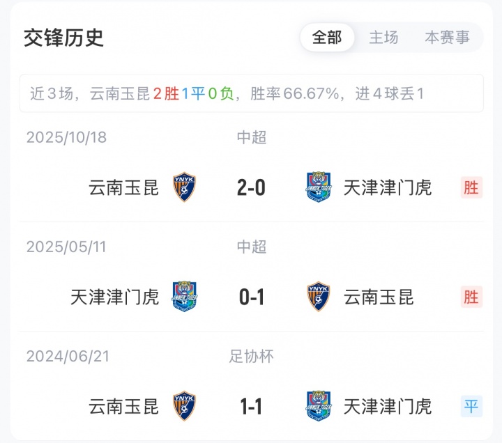 前5轮中超,云南玉昆3胜2负积9分排名积分榜第三,天津津门虎2平3负未尝一胜,负8分垫底。