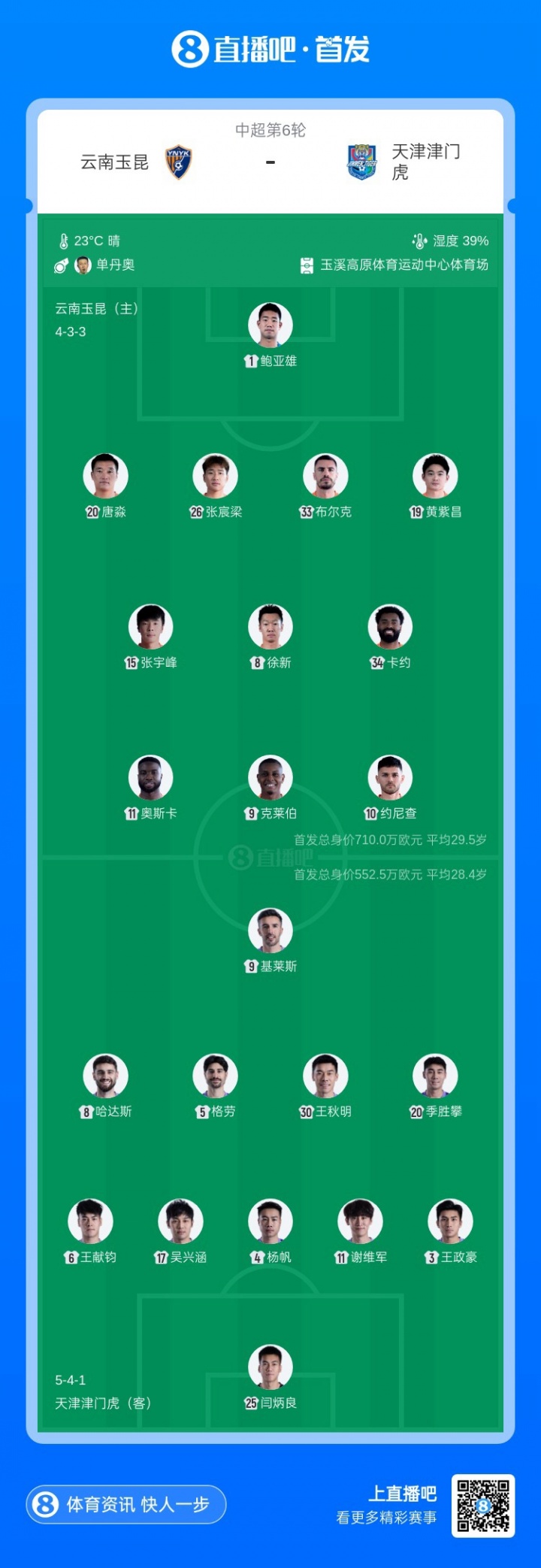 直播吧04月17日讯 今晚20点中超第6轮云南玉昆vs天津津门虎,赛前首发阵容公布。