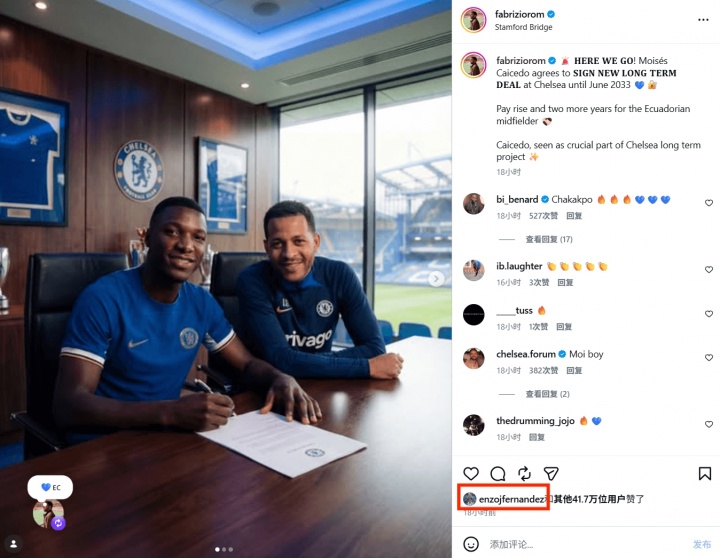 直播吧04月17日讯 罗马诺昨天发文用标志性的Here We Go确认,凯塞多与切尔西涨薪续约至2033年。恩佐本人在这条帖文下点赞。