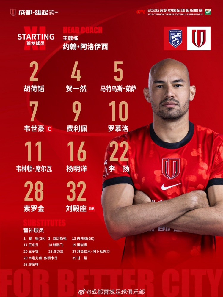 武汉三镇vs成都蓉城比赛首发名单出炉!成都,雄起!