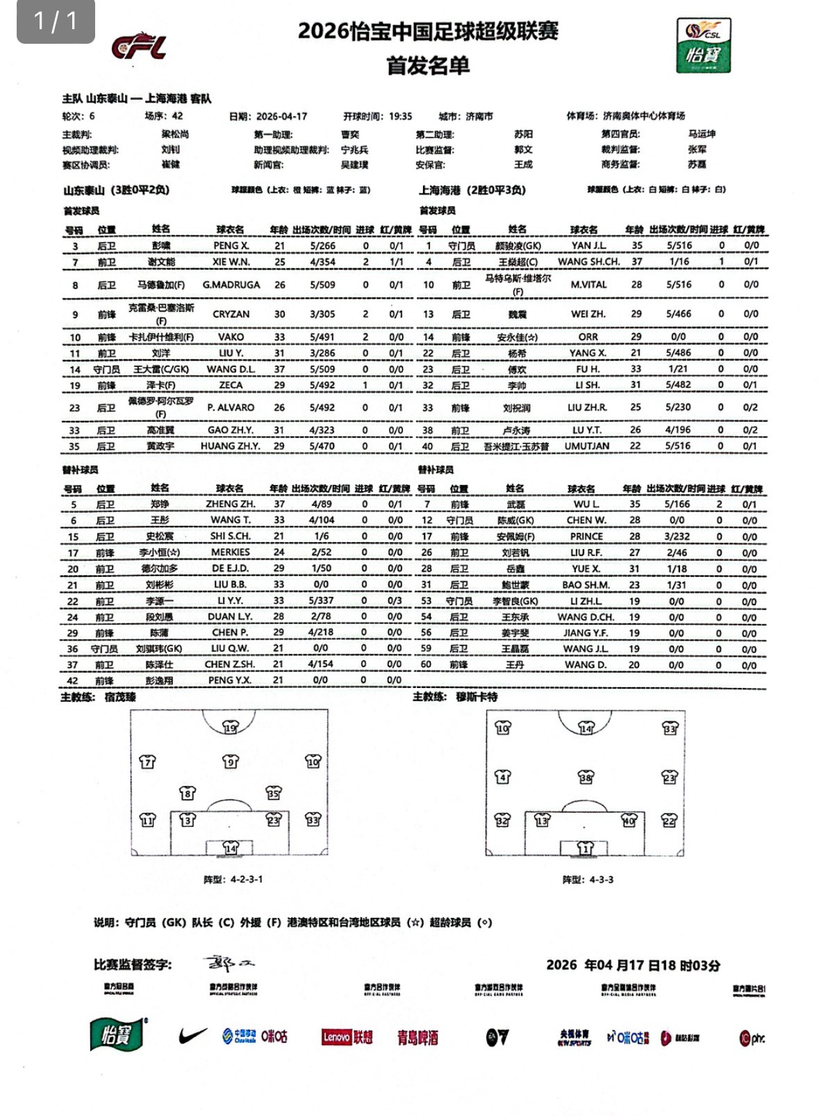 直播吧04月17日讯 中超第6轮,山东泰山vs上海海港,海港外援莱昂纳多热身时受伤,刘祝润顶替其先发,海港本场仅单外援出战。