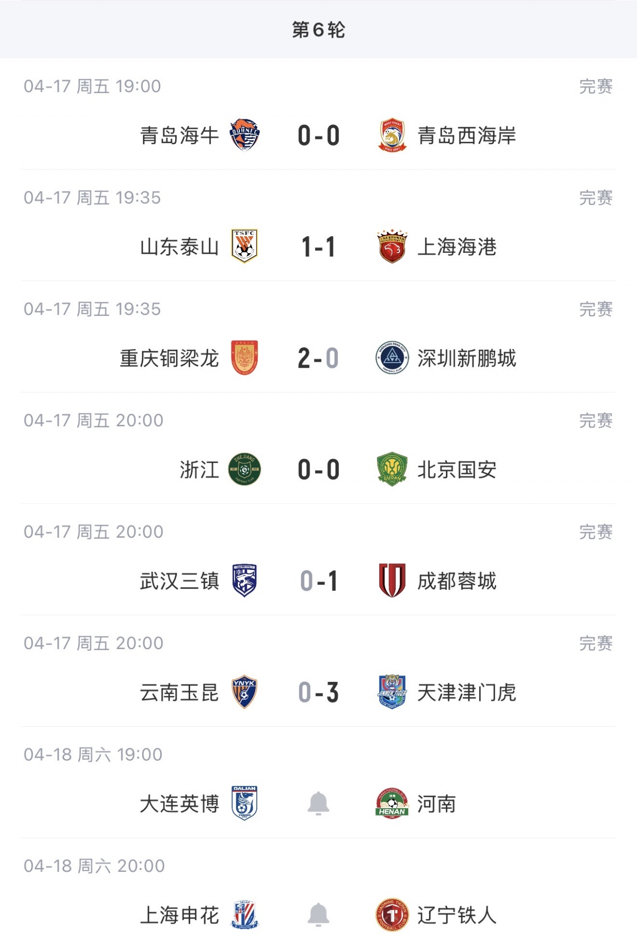 直播吧04月17日讯 中超第6轮结束6场比赛的较量,最新积分榜如下。