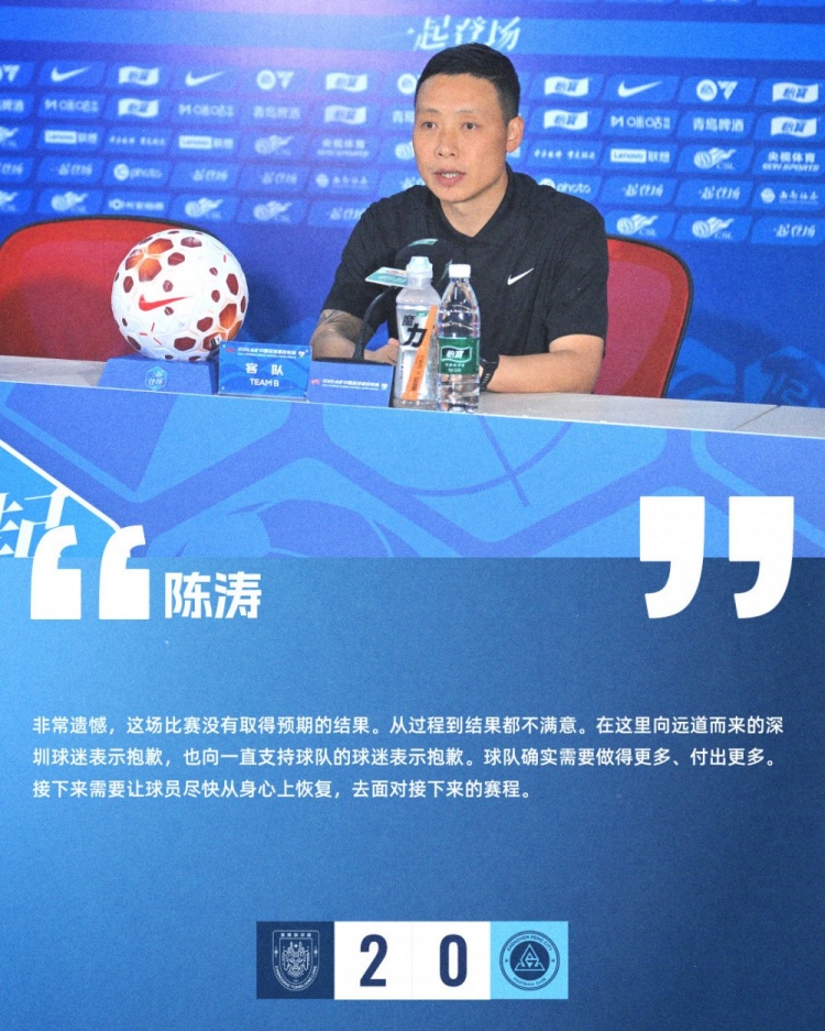 赛后新闻发布会上,主教练陈涛表示:“非常遗憾,这场比赛没有取得预期的结果。从过程到结果都不满意。在这里向远道而来的深圳球迷表示抱歉,也向一直支持球队的球迷表示抱歉。球队确实需要做得更多、付出更多。接下来需要让球员尽快从身心上恢复,去面对接下来的赛程。”