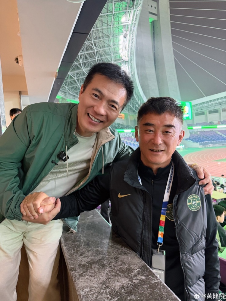 黄健翔在社媒写道:“第一次在黄龙体育场看球,遇到两位老朋友,傅博,现在浙江队教练组。另外一位,大家都认识,国足主帅邵佳一。他自己说,现在每到周末就四处奔波看联赛,考察国内的队员。明天他要去大连。大连的朋友们准备好了吗?”