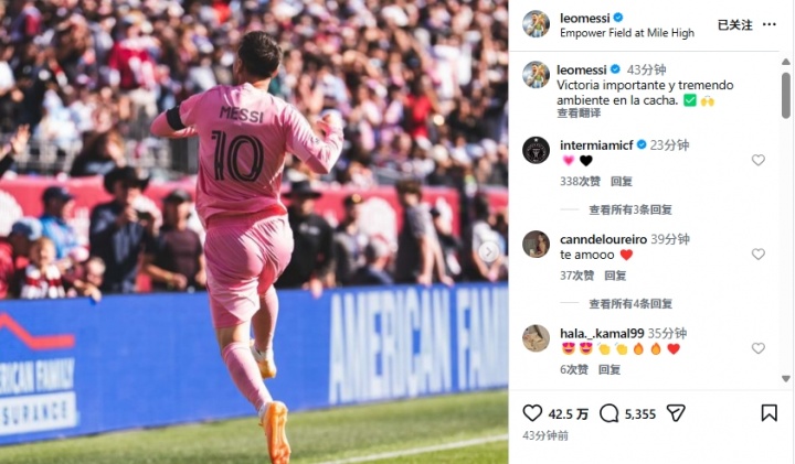 >超7.5万人观战!梅西更新社媒:重要的胜利,场上气氛非常热烈
