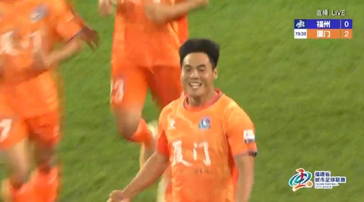 直播吧04月19日讯 2026福建省城市足球联赛揭幕战,福州vs厦门。比赛第80分钟,厦门队3-0锁定胜局!刚刚替补登场的沈文剑从中场一路长驱直入一条龙破门。