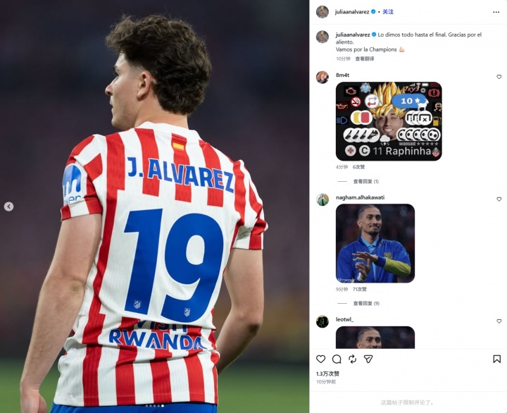 赛后,阿尔瓦雷斯在社媒首度发声,谈到了这场失利。他写道:“我们付出了一切,直到最后。谢谢你们的鼓励。接下来让我们一起将注意力转向欧冠吧!”