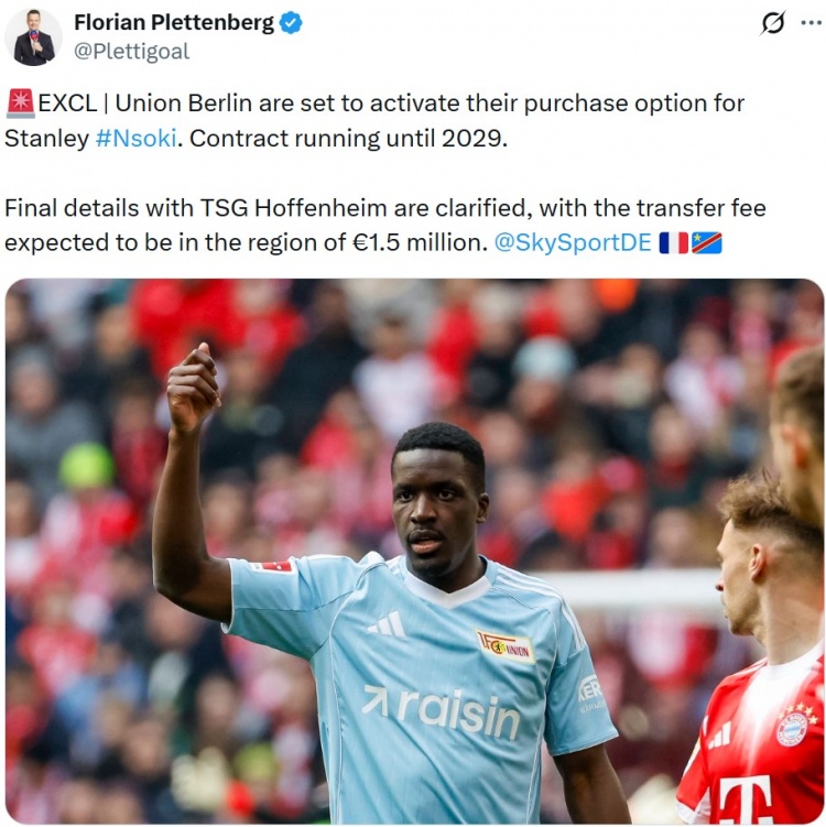 直播吧4月19日讯 据德天空记者Florian Plettenberg报道,柏林联合即将激活斯坦利·恩索基的购买选项,并将与球员 签约至2029年。