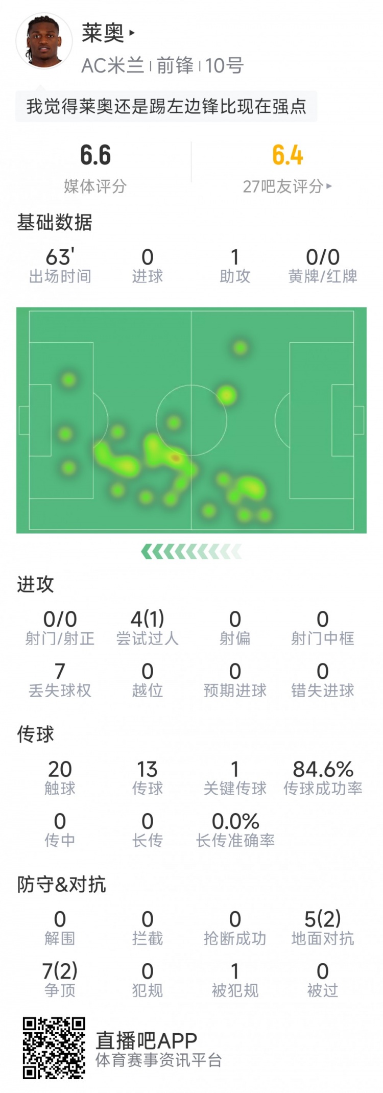 直播吧4月19日讯 在本轮意甲AC米兰对阵维罗纳的比赛中,莱奥送出助攻,以下为他在本场数据: