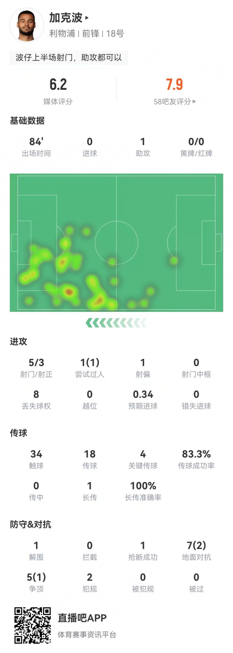 直播吧4月19日讯 利物浦在本轮英超对阵埃弗顿,加克波本场数据如下: