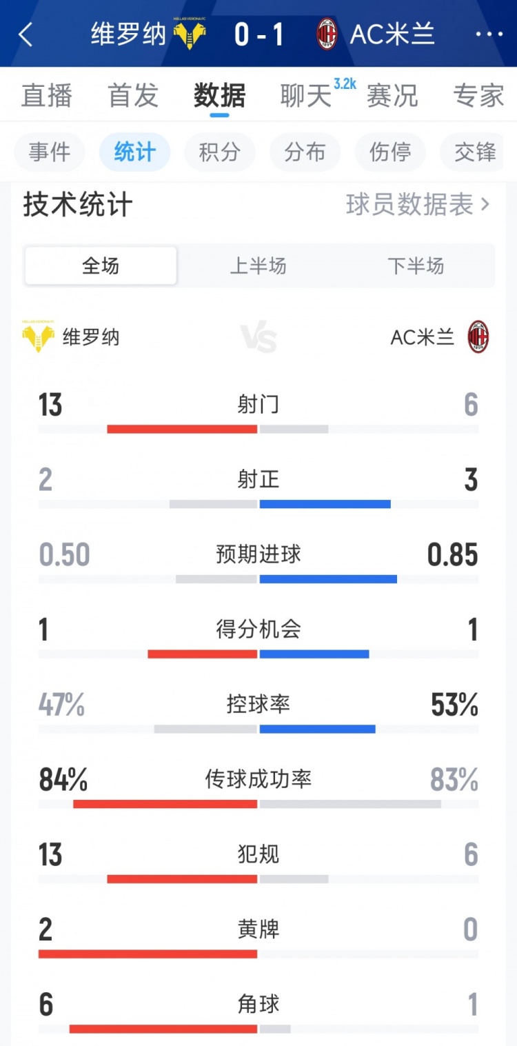 直播吧4月19日讯 在本轮意甲,AC米兰1-0击败维罗纳,以下为双方全场数据对比:
