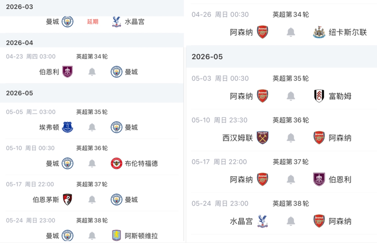 曼城少赛1场落后3分,曼城与阿森纳剩余的联赛赛程对比如上图。