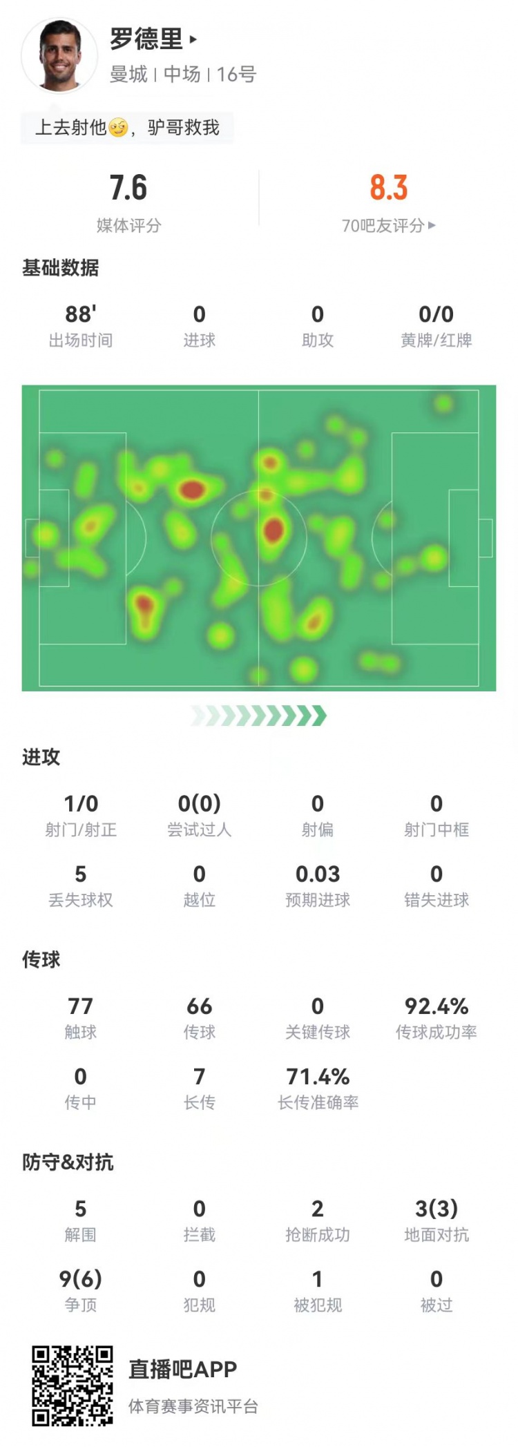 直播吧4月20日讯 曼城在本轮英超对阵阿森纳,罗德里本场数据如下: