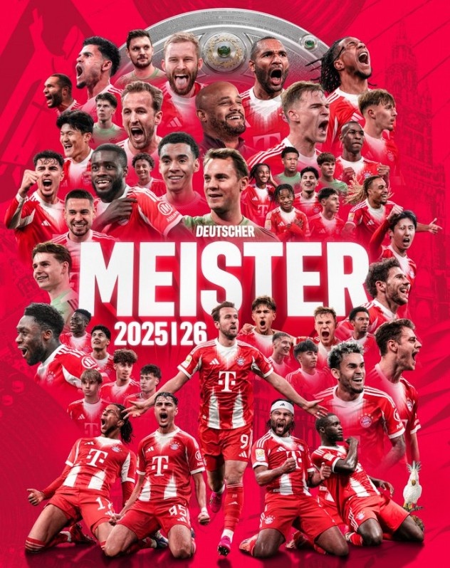 拜仁官推晒海报庆祝球队提前夺得德甲冠军,凯恩、诺伊尔C位